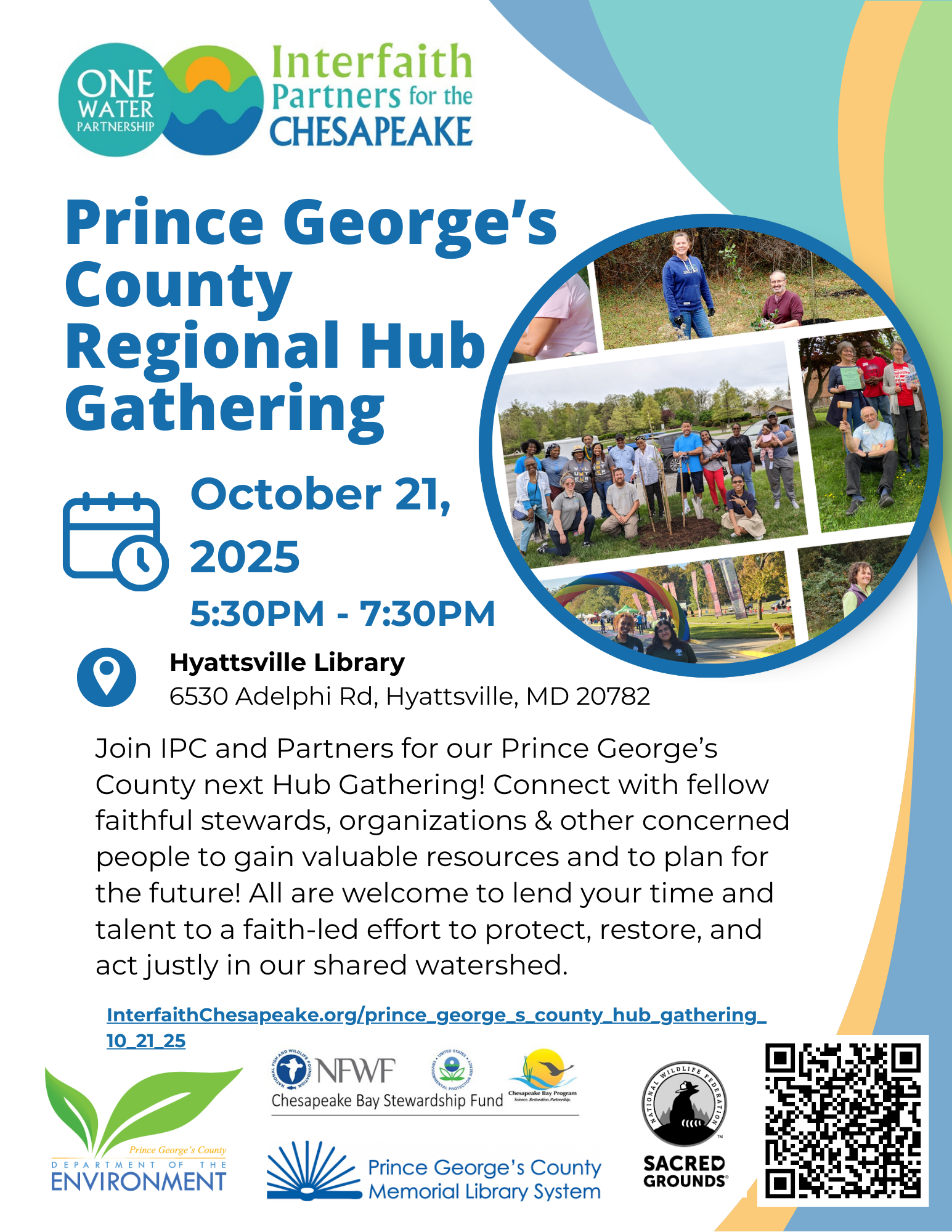 Join us for the One Water Partnership Prince George’s County Hub Gathering and be part of a growing movement of faith communities working together to heal and protect our local waters through the One Water Partnership. This is your chance to connect with neighbors, learn about impactful projects already making a difference, and discover how your congregation can be part of the solution!